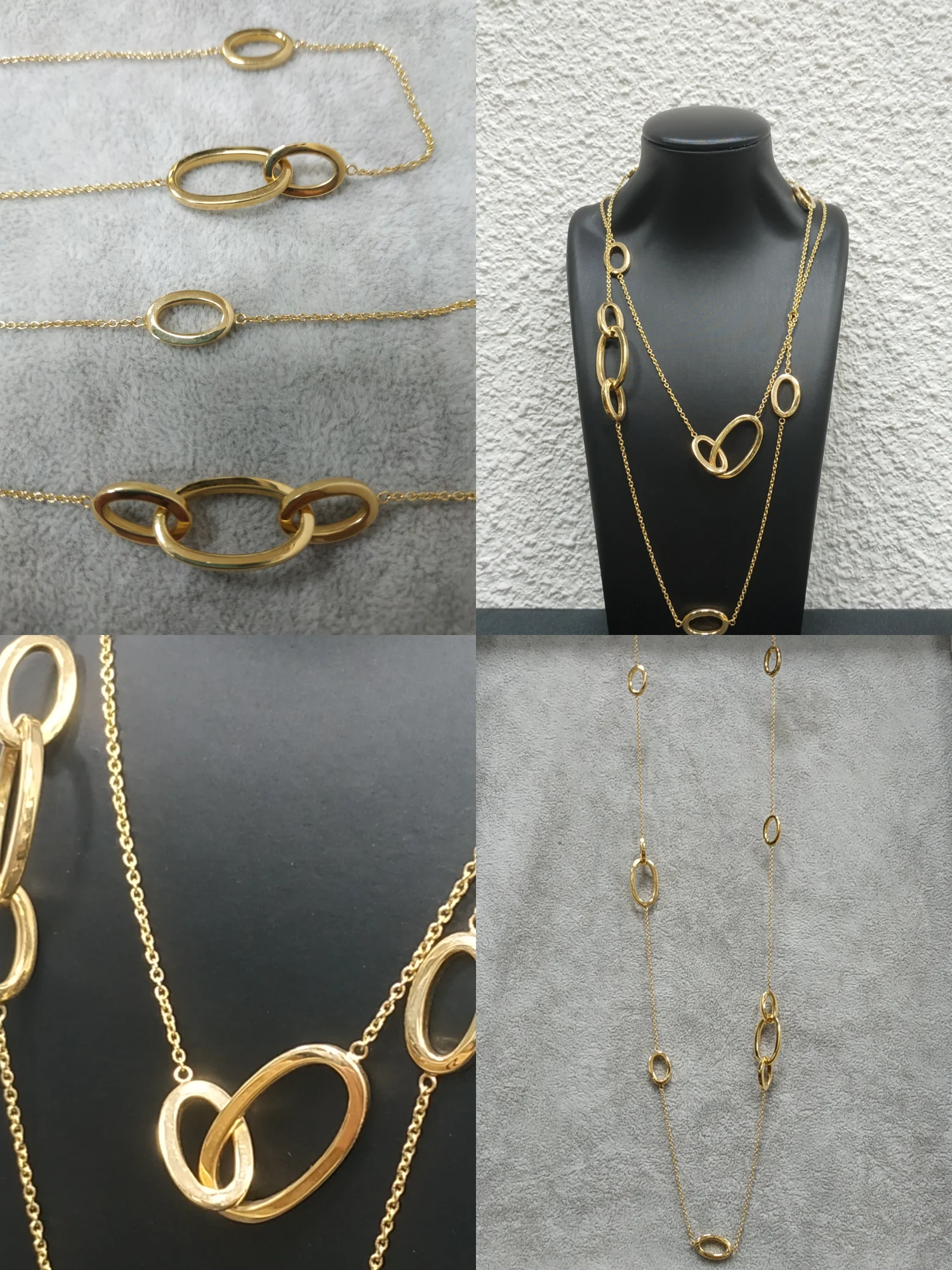 Elegante cadena rolo larga en oro amarillo de 18 kilates con eslabones ovales de dos tamaños. Longitud extra de 80cm ideal para looks modernos y versátiles.