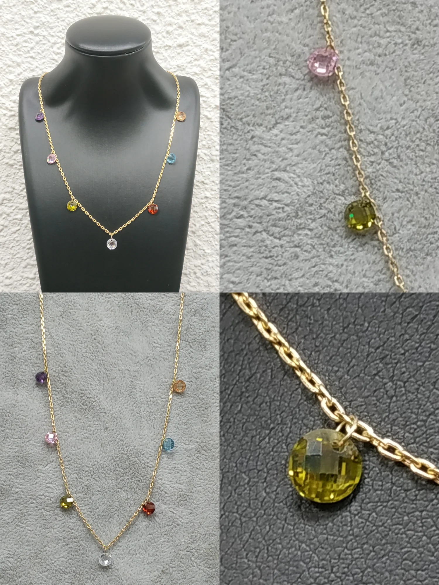 Alegre collar con 7 circonitas de colores en talla briolette engastadas en oro amarillo de 18 kilates. Efecto arcoíris elegante.