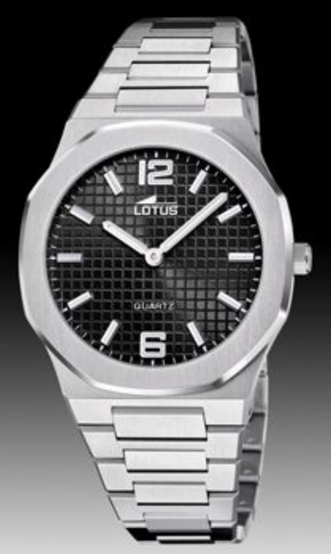 Reloj Lotus Excellent con caja octagonal integrada y esfera negra texturizada. Diseño contemporáneo y versátil.