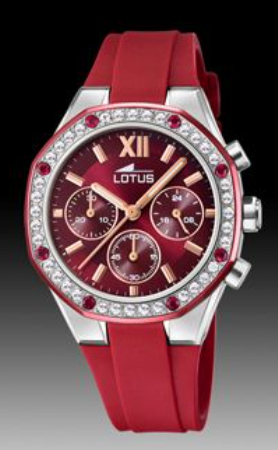 Reloj Lotus multifunción en burdeos con bisel de circonitas y correa de silicona. Estilo sport-chic.